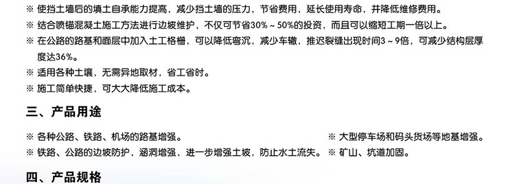 該產(chǎn)品適用于修建公路、鐵路以及江河湖海岸邊的加筋檔土墻、堤壩、橋面、陡坡及土工格室等工程。其作用是可提土墻或堤壩的承載力,延長使用壽命,減少占地面積,縮短工期,降低造價,減小維修費用。